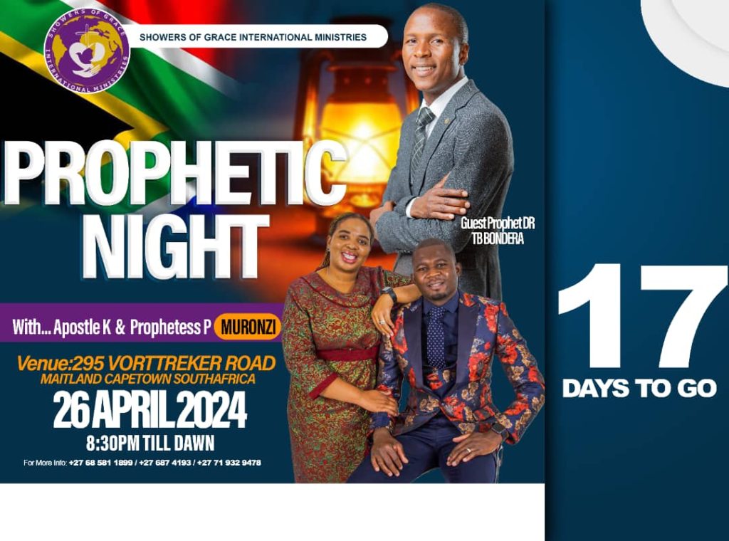 Major Prophet Dr. Tawanda Blessing Bondera to Bring Prophetic Night to Capetown, South Africa On the 26th of April 2024, Capetown will be graced with the presence of Major Prophet Dr. Tawanda Blessing Bondera, a renowned figure in the realm of spirituality, as he leads a prophetic night at 295 Vorttreker Road, Maitland, Capetown. The event is scheduled to commence at 8:30 PM and extend till dawn, promising an unforgettable evening filled with divine revelations and spiritual empowerment.Hosted by the esteemed duo of Apostle K and Prophetess P Muronzi, the prophetic night anticipates an influx of believers and seekers from all walks of life, eager to experience the transformative power of Prophet Dr. TB Bondera’s prophetic ministry. With a reputation for delivering profound messages and accurate prophecies, Prophet Dr. TB Bondera’s visit is expected to ignite a spiritual awakening among attendees.The event promises to be a beacon of hope and inspiration, offering congregants an opportunity to connect with the divine and receive guidance for their life’s journey. Through prayer, worship, and the prophetic word, Prophet Dr. TB Bondera aims to instill faith, healing, and restoration in the hearts of those in attendance, setting the stage for miraculous encounters and supernatural breakthroughs.In addition to the prophetic night, Major Prophet Dr. TB Bondera will also be participating in an anointing service on Sunday, the 28th of April 2024, once again hosted by Apostle K and Prophetess P Muronzi. This service offers believers a sacred opportunity to experience the tangible presence of God and receive an impartation of divine grace and favor.The anticipation surrounding Prophet Dr. TB Bondera’s visit to Capetown is palpable, with many eager to witness firsthand the manifestation of God’s power and glory. Believers are encouraged to come with open hearts and expectant spirits, ready to receive the blessings and breakthroughs that await them.As the countdown to the prophetic night begins, organizers are working tirelessly to ensure a seamless and impactful event that will leave a lasting impression on all who attend. With faith as their guide and love as their compass, they are committed to creating an atmosphere where miracles abound and lives are forever changed.For those unable to attend in person, the event will be live-streamed on GHMI official facebook page, allowing viewers from around the world to partake in the divine experience unfolding in Capetown. Regardless of location, all are invited to join in this momentous occasion and receive the blessings that flow from the hand of God through Prophet Dr. TB Bondera.As Capetown prepares to welcome Prophet Dr. TB Bondera for this historic gathering, the atmosphere is charged with anticipation and expectation. Believers are poised to encounter the supernatural and embrace a new dimension of faith as they embark on this transformative journey with Major Prophet Dr. Tawanda Blessing Bondera.Story by Judith Matanire GHMI Media